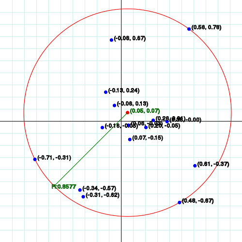 classPoint<Struct.new(:x,:y)# Generates a random point around (0,0) with radius = 1defself.randomradius=randtheta=360*randPoint.new(radius*Math.cos(theta),radius*Math.sin(theta))end# Returns true if x is close to y as defined by epsdefself.close_to(x,y,eps=1e-9)return(x-y).abs<epsenddefself.rad2deg(a)return(a*180.0)/Math::PIenddefnormal_leftPoint.new(self.y,-self.x)end# Returns the point at the center of this point# and the other_pointdefcenter(other_point)Point.new((self.x+other_point.x)/2.0,(self.y+other_point.y)/2.0)end# Computes the distance between self and other_pointdefdistance(other_point)((self.x-other_point.x)**2+(self.y-other_point.y)**2)**0.5enddefself.inf_line_intersection(base1,v1,base2,v2)if(Point.close_to(v1.x,0.0)&&Point.close_to(v2.y,0.0))returnPoint.new(base1.x,base2.y)endif(Point.close_to(v1.y,0.0)&&Point.close_to(v2.x,0.0))returnPoint.new(base2.x,base1.y)endm1=!Point.close_to(v1.x,0.0)?v1.y/v1.x:0.0m2=!Point.close_to(v2.x,0.0)?v2.y/v2.x:0.0ifPoint.close_to(m1,m2)returnnilendc1=base1.y-m1*base1.xc2=base2.y-m2*base2.xix=(c2-c1)/(m1-m2)iy=m1*ix+c1ifPoint.close_to(v1.x,0.0)returnPoint.new(base1.x,base1.x*m2+c2)endifPoint.close_to(v2.x,0.0)returnPoint.new(base2.x,base2.x*m1+c1)endreturnPoint.new(ix,iy)end# compute the polar angle of this pointdefpolartheta=0.0ifPoint.close_to(self.x,0)ifself.y>0theta=90.0elsifself.y<0theta=270.0endelsetheta=Point.rad2deg(Math.atan(self.y/self.x))ifself.x<0.0theta+=180.0endiftheta<0.0theta+=360.0endendthetaend# Computes the angle formed by p1 - self - p2defangle_between(p1,p2)vect_p1=p1-selfvect_p2=p2-selftheta=vect_p1.polar-vect_p2.polartheta+=360.0iftheta<0.0theta=360.0-thetaiftheta>180.0returnthetaenddef==(other_point)returnPoint.close_to(self.x,other_point.x)&&Point.close_to(self.y,other_point.y)end# We define sort order of Points based on x coordinate, then y coordinatedef<=>(other_point)ret=self.x<=>other_point.xifret==0ret=self.y<=>other_point.yendretend# Subtract other_point from selfdef-(other_point)Point.new(self.x-other_point.x,self.y-other_point.y)end# Add other_point to selfdef+(other_point)Point.new(self.x+other_point.x,self.y+other_point.y)end# Scale this point by the provided factordefscale(factor)Point.new(self.x*factor,self.y*factor)end# Pretty print a pointdefto_s"(%5.4f, %5.4f)"%[x,y]endendclassCircle<Struct.new(:center,:radius)# Returns true if this Circle contains the given Pointdefcontains?(point)point.distance(self.center)<self.radius||(point.distance(self.center)-self.radius).abs<1e-9enddefto_s"{center:%s, radius:%5.4f}}"%[center.to_s,radius]endendrequire'set'classSolver<Struct.new(:mec)definitialize(debug)@points=SortedSet.new@debug=debugend# add a point to the solver and recalcluate the minimum enclosing# circle if the point lies outise the current MEC.defadd_point(point)puts"adding p: #{point}"if@debug@points<<pointifself.mec&&self.mec.centerunlessself.mec.contains?(point)iterateendelseiterateendend# Tests if a point is left|on|right of a infinite line# return >0 for p2 left of line through p0 and p1# return = 0 for p2 on the line# return <0 for p2 right of the linedefdirection(p0,p1,p2)return(p0.x-p1.x)*(p2.y-p1.y)-(p2.x-p1.x)*(p0.y-p1.y)end# Computes the set of points that represents the# convex hull of the Solver's @pointsdefconvex_hulla=@points.to_aleft=a.firsta=a[1..-1]right=a.popputs"left = #{left} right = #{right} a = #{a.map{|p|p.to_s}.join(",")}"if@debugupper=[]lower=[]# Partition remaining points into upper and lower bucketsa.eachdo|p|dir=direction(left,right,p)puts"p = #{p} dir = #{dir}"if@debugifdir<0upper<<pelselower<<pendendputs"upper = #{upper.map{|p|p.to_s}.join(', ')}"if@debugputs"lower = #{lower.map{|p|p.to_s}.join(', ')}"if@debugupper_hull=half_hull(left,right,upper,-1)lower_hull=half_hull(left,right,lower,1)puts"upper_hull = #{upper_hull.map{|p|p.to_s}.join(', ')}"if@debugputs"lower_hull = #{lower_hull.map{|p|p.to_s}.join(', ')}"if@debug(upper_hull+lower_hull).uniqend# Computs a half hulldefhalf_hull(left,right,input,factor)input=input.dupinput<<righthalf=[]half<<leftputs"input: #{input.map{|p|p.to_s}.join(', ')}"if@debuginput.eachdo|p|half<<pputs"half: #{half.map{|p|p.to_s}.join(', ')}"if@debugwhilehalf.size>=3dir=factor*direction(half[-3],half[-1],half[-2])ifdir<=0half.delete_at(half.size-2)elsebreakendendendhalfend# Recalculates the MEC after the addition of a new pointdefiterateself.mec||=Circle.new# Handle degenerate cases firstif@points.size==1self.mec.center=@points.to_a[0]self.mec.radius=0elsif@points.size==2a=@points.to_aself.mec.center=a[0].center(a[1])self.mec.radius=a[0].distance(self.mec.center)elseputs"points = #{@points.map{|p|p.to_s}.join(",")}"if@debuga=convex_hullputs"convex hull = #{a.map{|p|p.to_s}.join(', ')}"if@debugpoint_a=a[0]point_c=a[1]while(true)point_b=nilbest_theta=180.0;forpointin@pointsifpoint!=point_a&&point!=point_ctheta_abc=point.angle_between(point_a,point_c)puts"a: #{point_a} c: #{point_c} p: #{point} best_theta: #{best_theta} theta_abc: #{theta_abc}"if@debugiftheta_abc<best_thetapoint_b=pointbest_theta=theta_abcendendendputs"Found best theta: #{best_theta}, a = #{point_a}, b = #{point_b}, c = #{point_c}"if@debugifbest_theta>=90.0||point_b.nil?self.mec.center=point_a.center(point_c)self.mec.radius=point_a.distance(self.mec.center)returnself.mecendang_bca=point_c.angle_between(point_b,point_a)ang_cab=point_a.angle_between(point_c,point_b)puts"ang_bca = #{ang_bca}, ang_cab = #{ang_cab}"if@debugifang_bca>90.0point_c=point_belsifang_cab<=90.0puts"breaking ..."if@debugbreakelsepoint_a=point_bendendch1=(point_b-point_a).scale(0.5)ch2=(point_c-point_a).scale(0.5)n1=ch1.normal_leftn2=ch2.normal_leftch1=point_a+ch1ch2=point_a+ch2self.mec.center=Point.inf_line_intersection(ch1,n1,ch2,n2)self.mec.radius=self.mec.center.distance(point_a)endself.mecendenddefdistance(p1,p2)returnp1.distance(p2)end# Use algorithm invented by Pr. Chrystal (1885)# Port of code in a Java Applet found at# http://www.personal.kent.edu/~rmuhamma/Compgeometry/MyCG/CG-Applets/Center/centercli.htm
